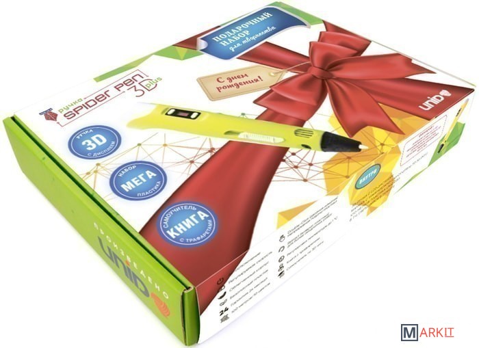 Комплектация - 3D ручка Spider Pen PLUS;- Книга трафаретов;- 10 цветов пластика PLA (в том числе, светящийся в темноте);- Адаптер питания;- Подарочная красочная упаковка;- Инструкция.
