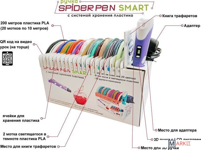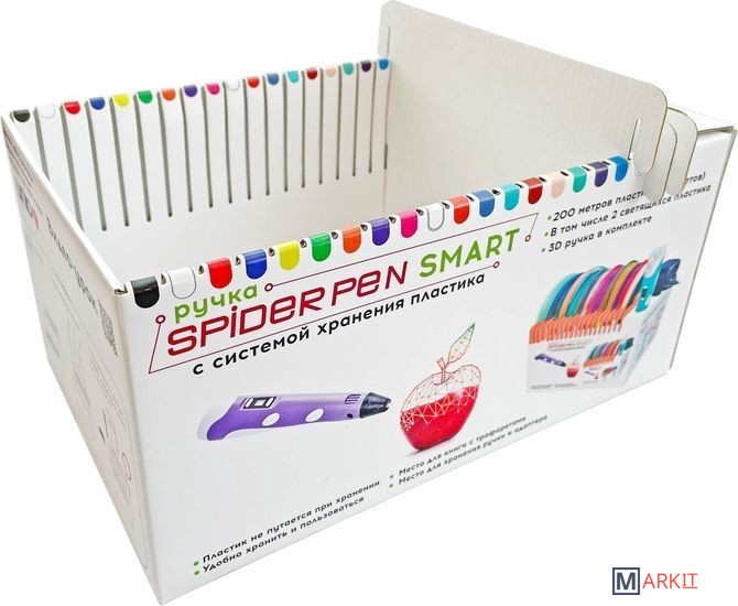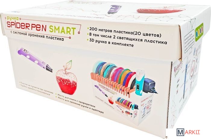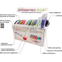 | Комплектация | 3D ручка Spider Pen PLUS;Книга трафаретов;20 цветов пластика PLA (в том числе 2 светящихся в темноте);Адаптер питания;Русифицированная и красочная упаковка;Инструкция. |