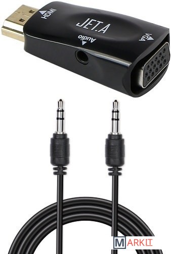 Переходник HDMI (male) - VGA (female), на корпусе устройства предусмотрено гнездо mini jack 3.5 мм для передачи звукового сигнала, а также в комплекте присутствует аудиокабель (0.5 м).