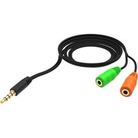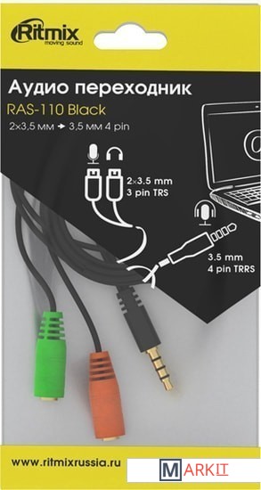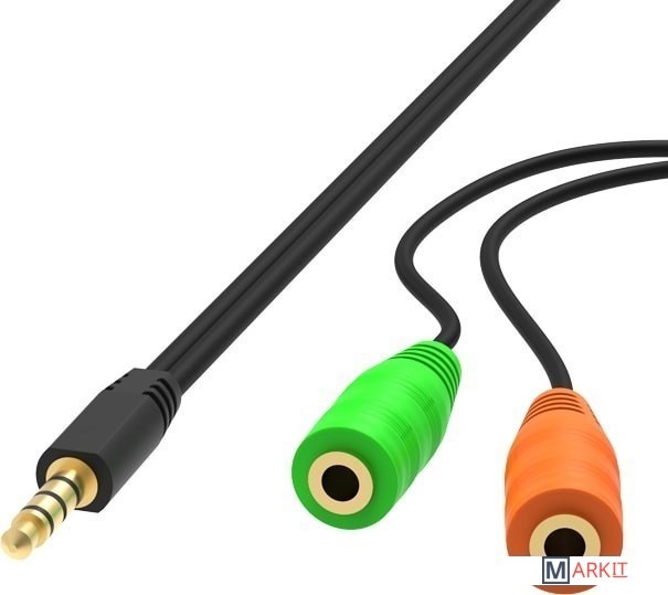 Аудио-переходник для подключения компьютерных гарнитур с двумя jack 3,5 мм (или микрофона и наушников) к устройству с совмещённым разъёмом jack 3,5 мм 4pin.