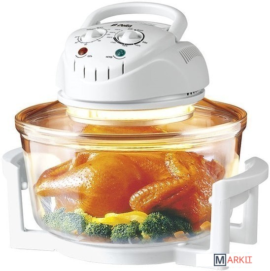 Аэрогриль - многофункциональный бытовой прибор, предназначенный для приготовления пищи в бытовых и аналогичных им условиях.В аэрогриле реализована технология конвективного обогрева - термической обработки продуктов потоком горячего воздуха.Чаша из высококачественного жаропрочного стекла.Расширительное кольцо, предназначенное для увеличения полезного объема аэрогриля при приготовлении крупной птицы, рыбы, больших кусков мяса (например, свиной ноги), а также для стерилизации банок и приготовления нескольких блюд одновременно.При использовании кольца-расширителя объем чаши становится больше на 5 л, а время приготовления необходимо увеличить на 15 минут.Световые индикаторы работы и нагрева.Съемный сетевой шнур.Высокая решетка.Низкая решетка.Щипцы-ухваты для извлечения решетки.Тип управления - механический.Регулируемая температура приготовления.Таймер на 60 минут.Автоматическое поддержание температуры.Режим самоочистки.Автоматическое отключение при поднятии ручки.