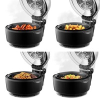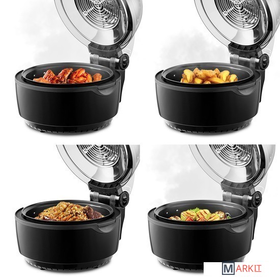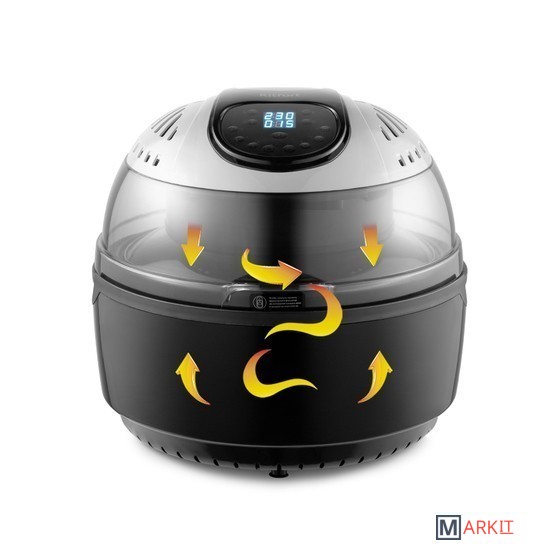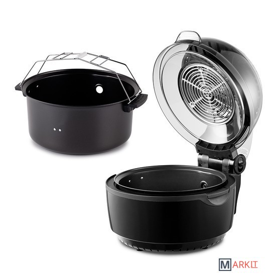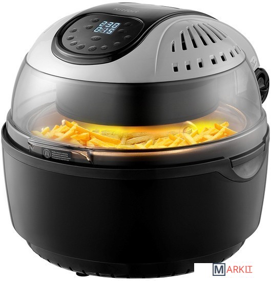 Современный классический аэрогриль Kitfort КТ-2240 замечателен стильным дизайном, а также позволяет готовить большинство продуктов без добавления масла. Например, картошку, мясо, рыбу, птицу, овощи, выпечку и многое другое.Вентилятор, расположенный в верхней части аэрогриля, обеспечивает циркуляцию горячего воздуха от нагревателя внутри рабочей емкости. Тем самым, продукты равномерно обжариваются со всех сторон, получаются нежными внутри и с хрустящей корочкой снаружи.Аэрогриль оснащен электронным управлением и дисплеем, а также у прибора есть 6 автоматических программ. Вы можете начать приготовление в установленное время, используя функцию отложенного старта. На дисплее отображается температура и время приготовления.В комплекте к аэрогрилю идут вертел для приготовления курицы целиком, решетка, вращающаяся корзина. На решётке можно располагать продукты или термостойкие чаши и готовить в них. Вращающаяся корзина подходит для приготовления картошки-фри и других блюд.Для удобного и безопасного извлечения чаши, решетки, других аксессуаров и готовых блюд, комплектацией предусмотрены щипцы. Имеются ручки крышки и чаши, а также фиксатор крышки для предотвращения ее случайного открывания. Ручки корзины не нагреваются.В центре находится галогеновая лампочка, которая подсвечивает продукты в чаше. Часть крышки сделана прозрачной, чтобы можно было наблюдать за процессом приготовления.Длина шнура: 1 м.