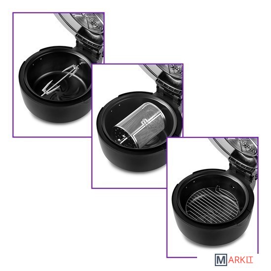 Комплект поставки - аэрогриль- вертел- решетка- вращающаяся корзина- щипцы
