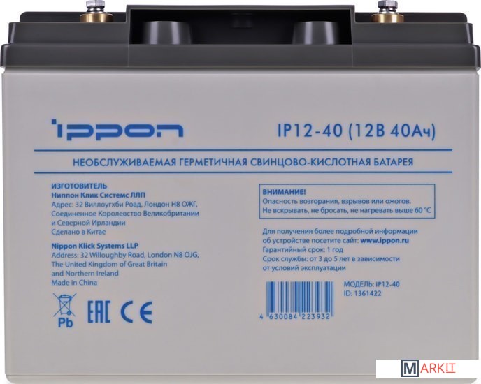 Markit » Аккумуляторы для ИБП » Аккумулятор для ИБП IPPON IP12-40 (12В/40 А·ч)