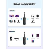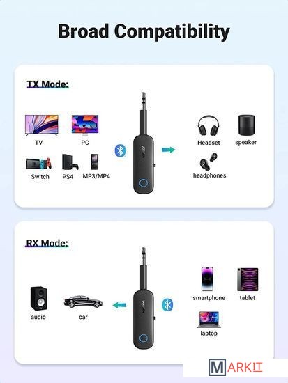 Опыт беспроводной музыки в Bluetooth 5.0. Ugreen Bluetooth Transmitter Receiver идеально подходит для подключения вашего Bluetooth устройства к вашим колонкам или Bluetooth колонки к аудиоустройству.Версия Bluetooth 5.0 минимизирует задержку и полностью убирает задержку синхронизации, что позволяет вам наслаждаться качеством звука HiFi.Двойной режим – прием или передача аудио сигнала. Простой переключатель на устройстве, чтобы выбрать функцию Bluetooth Receiving или Bluetooth Transmitting.Двухточечная функция подключения включена в режиме Tx. Аудио адаптер Bluetooth позволяет одновременно подключать двое наушников или другое Bluetooth-совместимое аудио устройство к телевизору, ноутбуку или любому другому устройству aux. Идеальное решение для обмена аудио с друзьями. Пожалуйста, обратите внимание, что два устройства Bluetooth должны находиться в пределах 5 метров.Режимы:Rx (получение). Функция приема для беспроводной передачи музыки с хост-устройств (смартфонов, планшетов, ноутбуков, компьютеров) на любые аудиоустройства с 3.5 мм или 2RCA-In, такие как автомобильные стереосистемы и док-станции для динамиков.Tx (передача). Поддержка подключения любого устройства вывода звука с портом Aux Out 3.5 мм или портом 2RCA, таких как компьютеры, телевизоры, домашняя стереосистема, проигрыватели компакт-дисков и Mp3 к Bluetooth устройствам, таким как, наушники Bluetooth, наушники и динамики.
