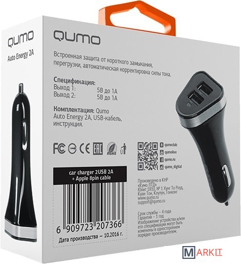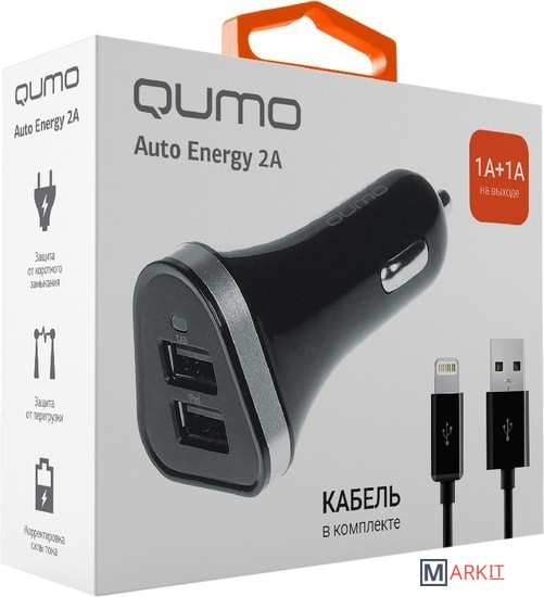 Markit » Зарядные устройства » Автомобильное зарядное QUMO Auto Energy 2A + кабель Apple 8 pin
