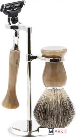 Бритвенный станок, совместимый с кассетами Gillette MACH3 (одна кассета в комплекте).Помазок с барсучьим ворсом.Материал рукояти: каучуковая смола, никелированная латунь.Подставка из металлического сплава.