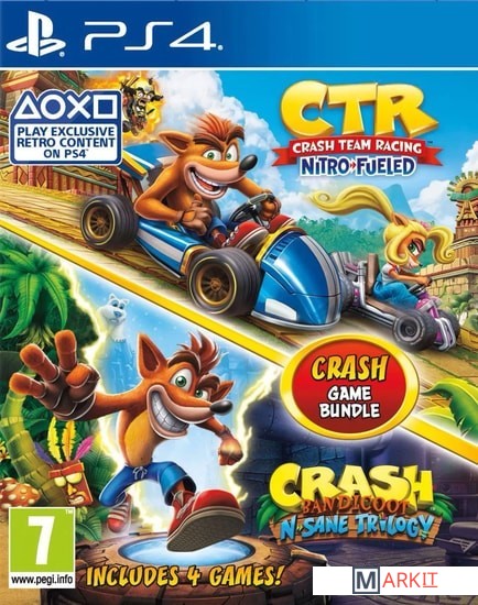 Бандикута стало еще больше! Наслаждайтесь четырьмя играми про эпические приключения знаменитого сумчатого героя с набором Crash Bandicoot, в который входят N. Sane Trilogy и Crash Team Racing Nitro-Fueled.Crash Bandicoot N.Sane TrilogyВоссоединитесь с любимым сумчатым Крэшем Бандикутом, который появится на PlayStation 4 вместе с тремя самыми запоминающимися приключениями, воссозданными в потрясающем качестве.Трилогия N. Sane Trilogy, включающая игры Crash Bandicoot, Crash Bandicoot 2: Cortex Strikes Back и Crash Bandicoot 3: Warped, была обновлена с нуля при помощи последних технологий. Для игр была записана новая музыка, а новые особенности помогут познакомить новое поколение игроков с классическим игровым процессом серии.Помешайте гнусным планам злобного доктора Нео Кортекса по созданию своей армии в первом приключении. Катайтесь на льду и летайте при помощи реактивного ранца, чтобы быстрее преодолевать большие открытые уровни во второй части. А затем путешествуйте сквозь время и пространство в Warped, сногсшибательном финале серии.Crash Team Racing: Nitro-FueledКрэш снова за рулем! Готовьтесь вдавить газ до отказа в Crash Team Racing Nitro-Fueled. Это все та же CTR, какой вы ее помните, но лучше и динамичнее.- Стартуйте с классическими игровыми режимами, персонажами, трассами, усилениями, оружием и схемами управления из оригинальной игры.- Мчитесь навстречу славе в дополнительных картах и на дополнительных трассах, которых не было в оригинале.- Соревнуйтесь по сети с друзьями и сокрушайте соперников, поднимаясь все выше в сетевых списках лидеров.В Crash Team Racing Nitro-Fueled ставки высоки, а конкуренция велика как никогда. Та самая CTR, которую вы любите и знаете, но теперь форсированная до предела.