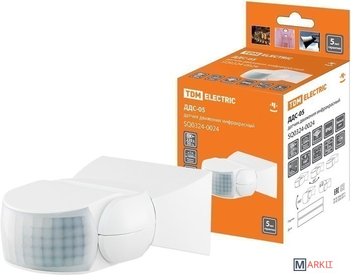 Для автоматического включения и отключения нагрузки в заданном интервале времени при появлении движущихся объектов в зоне обнаружения датчика и в зависимости от уровня освещенности в однофазных электрических сетях переменного тока напряжением 230В и частотой 50Гц.Монтаж к поверхности осуществляется при помощи саморезов и дюбелей, входящих в комплектацию.В качестве коммутирующего нагрузку элемента использовано электромеханическое реле.Имеется возможность регулировки порога срабатывания датчика в зависимости от уровня освещенности от 5 Лк до уровня солнечного света.Имеется возможность регулировки времени отключения датчика от нескольких секунд до нескольких минут.Датчик ДДС-05 имеет степень защиты IP65, что позволяет использовать его при любыъ погодных условиях на улице.Угол обнаружения составляет 180°.Дальность 12 м.