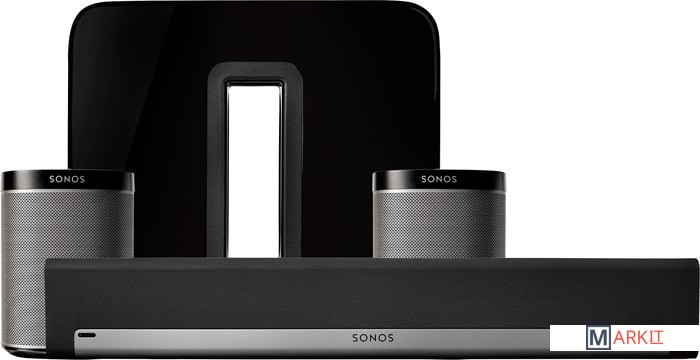 Набор беспроводной акустики для создания домашнего кинотеатра. Влючает саундбар Playbar, сабвуфер Sonos Sub и две колонки Sonos Play:1, которые используются в качестве тыловых каналов.