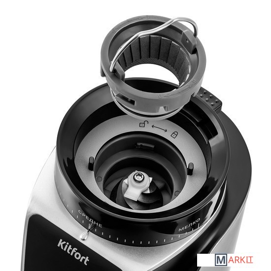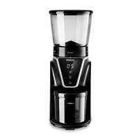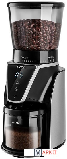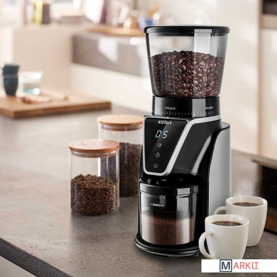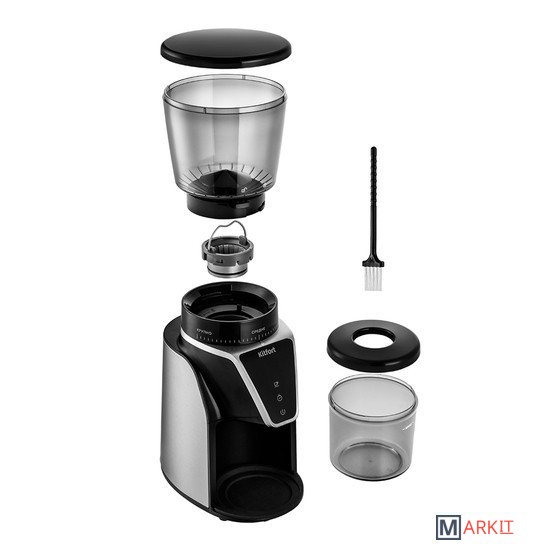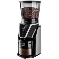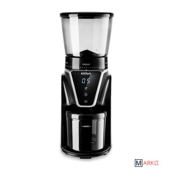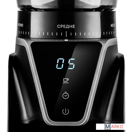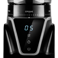 Кофемолка отличается высокой производительностью в 165 Вт, и за 1 цикл работы способна измельчить до 100 г продукта! Даёт равномерный помол и не перегревает кофе в отличие от роторных кофемолок. Нескользящие ножки делают прибор устойчивее на поверхности.У кофемолки есть LED-дисплей и сенсорное управление, что делает устройство удобным в использовании. Дисплей показывает время работы, количество чашек до 10 порций и таймер на 40 секунд. Сверху находится регулятор, где можно настроить степень помола.Длина шнура: 0.8 м.