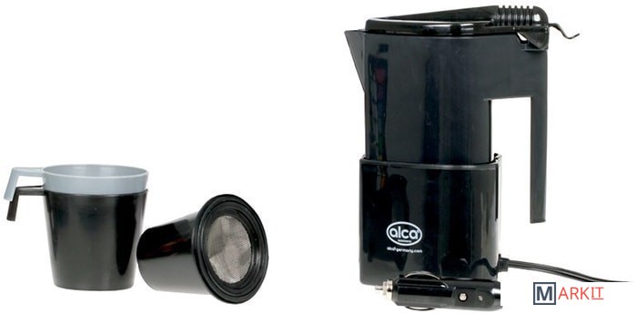 Включены 2 чашки и 1 фильтр для кофе и чая.Кипятит воду за 20 минут (примерно).Для бортовой сети 12В.Имеется предохранитель.Длина шнура питания: 0.8 м.