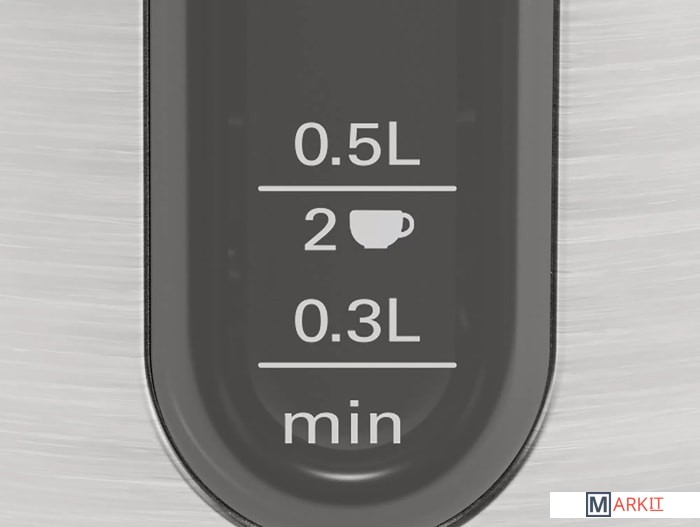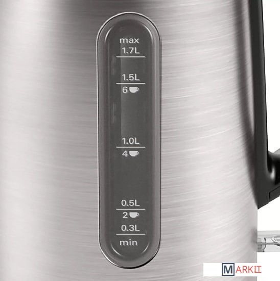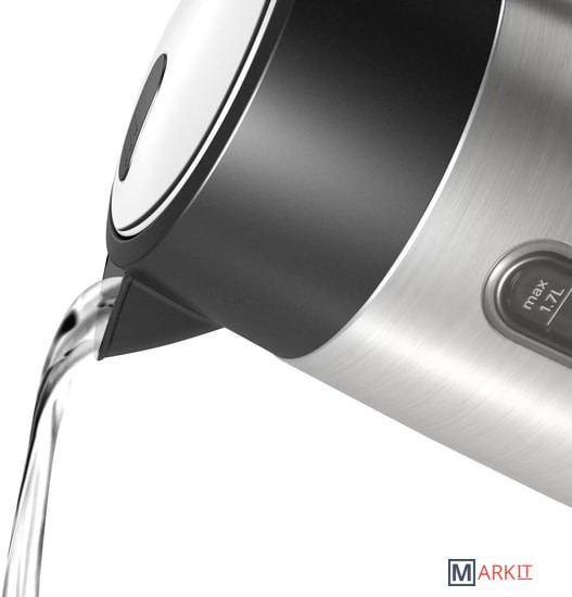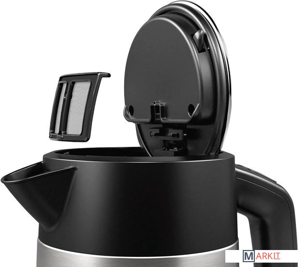 Съемный фильтр от накипи из нержавеющей стали;Легко чистить благодаря большой крышке, открывающейся на 90 градусов;Наполнение водой возможно через носик чайника;Анти-скользящий цоколь прибора;Отсек для намотки кабеля.