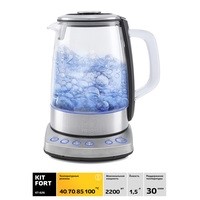 Электрический чайник с терморегулятором Kitfort КТ-626 может не только вскипятить воду, но и нагреть её до температуры 40, 70 и 85 °С, что очень удобно при заваривании различных сортов чая. Температура 40 °С пригодится для приготовления детского питания. Чайник также оснащён функцией поддержания температуры. Температура воды контролируется встроенным в дно чайника термодатчиком.