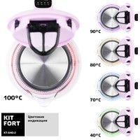 Электрический чайник с электронным терморегулятором Kitfort KT-640 может не только вскипятить воду, но и нагреть ее до температуры 40, 70, 80 и 90 °С, что очень удобно при заваривании различных сортов чая. Температура 40 °С пригодится для приготовления детского питания. Чайник также оснащен функцией поддержания температуры. Температура воды контролируется встроенным в дно чайника термодатчиком.