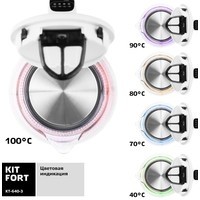 Электрический чайник с электронным терморегулятором Kitfort KT-640 может не только вскипятить воду, но и нагреть ее до температуры 40, 70, 80 и 90 °С, что очень удобно при заваривании различных сортов чая. Температура 40 °С пригодится для приготовления детского питания. Чайник также оснащен функцией поддержания температуры. Температура воды контролируется встроенным в дно чайника термодатчиком.