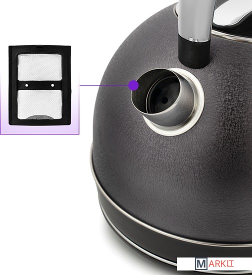 В носике чайника расположен съёмный фильтр, который задерживает частички накипи и предотвращает их попадание в чашку.Чайник оснащён контроллером Strix. Он устраняет риски короткого замыкания и возгорания прибора. Обеспечивает защиту при закипании, при включении чайника без воды и при снятии с базы во время работы.