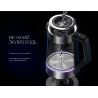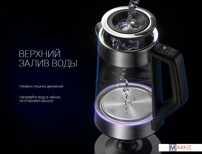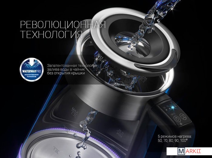 Автоматический/ручной выключательТехнология верхнего залива Waterway PROСветовой индикатор работыЗащита от перегреваФильтр для очистки водыПодсветка чайника в зависимости от выбранной температуры:- 50 град – зеленая подсветка- 70 град – голубая подсветка- 80 град – синяя подсветка- 90 град –розовая подсветка