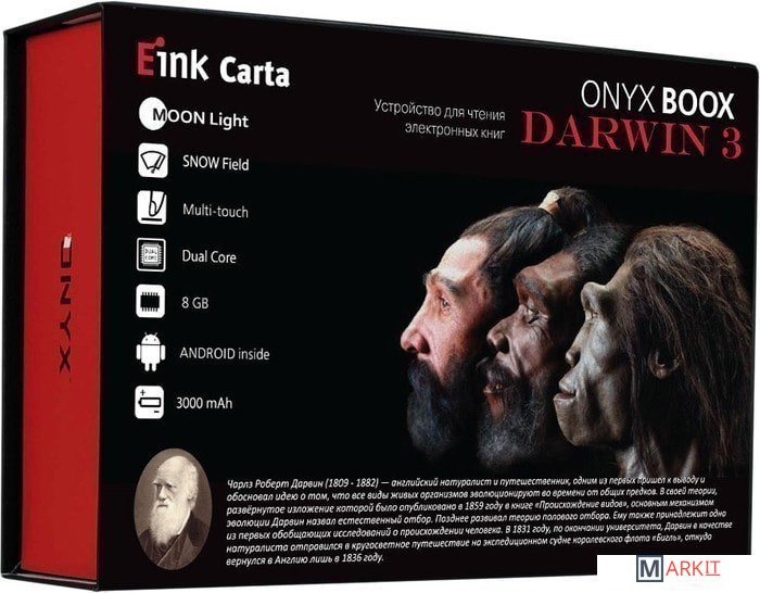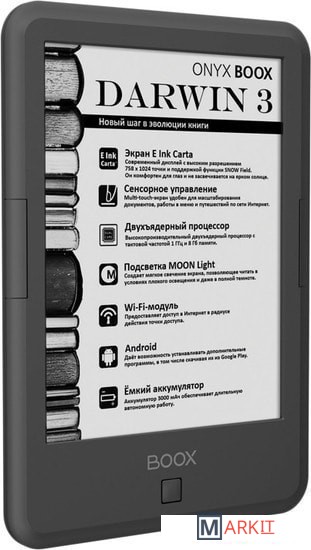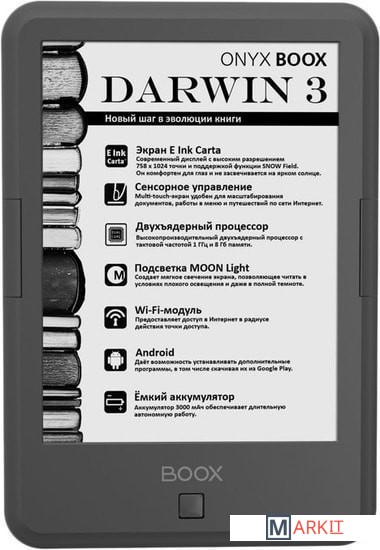 ONYX BOOX Darwin 3 — это устройство для чтения электронных книг с экраном типа «электронная бумага» E Ink Carta с функцией SNOW Field и встроенной системой подсветки MOON Light. Ридер имеет технические характеристики: высокопроизводительный 2-ядерный процессор, 512 МБ оперативной и 8 ГБ встроенной памяти.