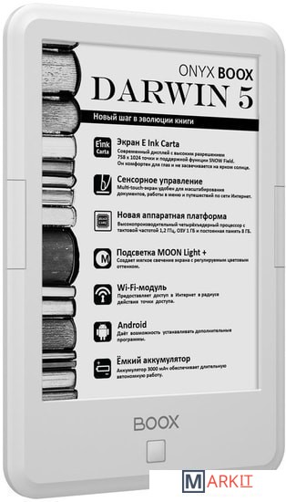 ONYX BOOX Darwin 5 — это устройство для чтения электронных книг с современным экраном типа «электронная бумага» E Ink Carta с функцией SNOW Field и встроенной системой подсветки MOON Light+ с регулировкой цветовой температуры.