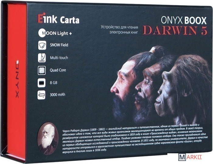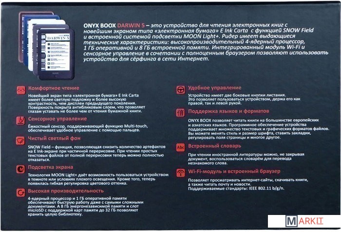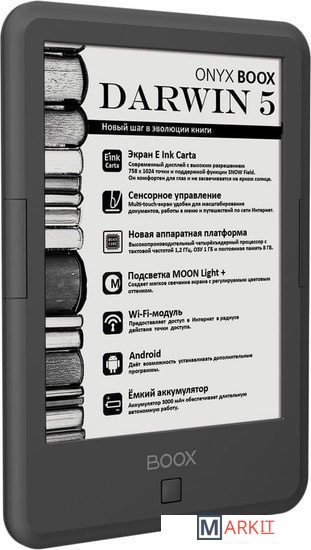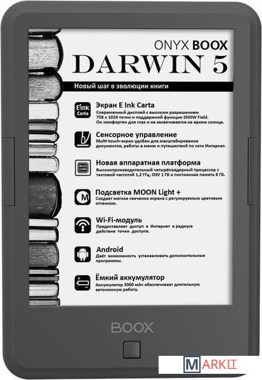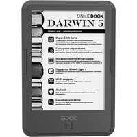 ONYX BOOX Darwin 5 — это устройство для чтения электронных книг с современным экраном типа «электронная бумага» E Ink Carta с функцией SNOW Field и встроенной системой подсветки MOON Light+ с регулировкой цветовой температуры.
