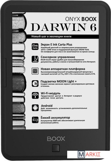 ONYX BOOX Darwin 6 — это устройство для чтения электронных книг с экраном последнего поколения E Ink Carta Plus, имеющим более высокие разрешение и контрастность, функцией SNOW Field и встроенной системой подсветки MOON Light+ с регулировкой цветовой температуры.