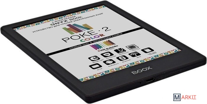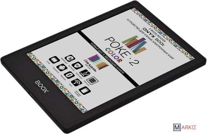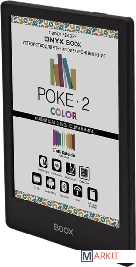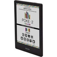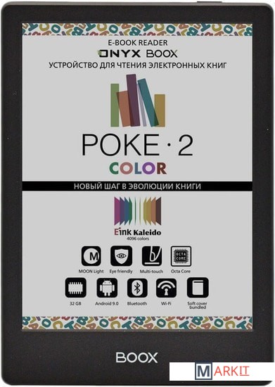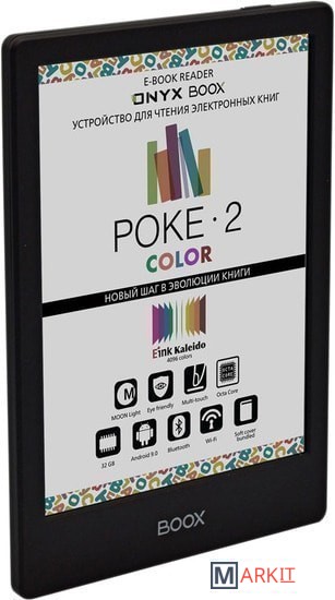 ONYX BOOX Poke 2 Color — первое в линейке производителя устройство с цветным экраном типа «электронная бумага» E Ink Kaleido. Ридер имеет компактный легкий корпус толщиной всего 6,8 мм и при этом оснащён высокопроизводительным 8-ядерном процессором, модулями Wi-Fi и Bluetooth, и управляется операционной системой Android 9.0.