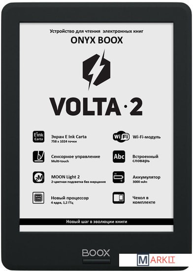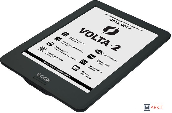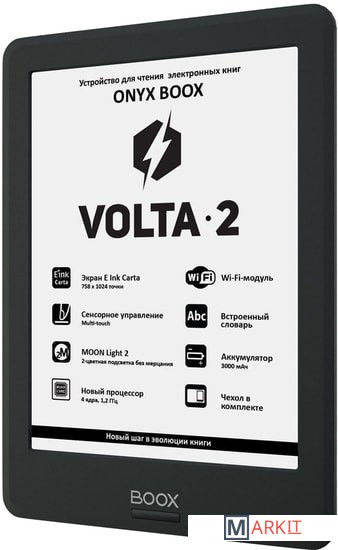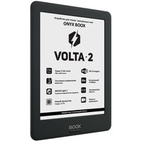 ONYX BOOX Volta 2 — устройство для чтения электронных книг с экраном типа «электронная бумага» E Ink Carta. Оно имеет систему немерцающей подсветки MOON Light 2 c возможностью регулировки оттенка цвета. Wi-Fi-модуль позволяет подключаться к сети Интернет. Возможности встроенного программного обеспечения позволяют настраивать практически любые параметры текста по желанию пользователя. А операционная система Android, на которой базируется модель, даёт возможность устанавливать сторонние программы для чтения. Аккумулятор 3000 мАч обеспечивает длительную автономную работу в режиме чтения. Устройство выполнено в компактном эргономичном корпусе и поставляется в комплекте с чехлом.