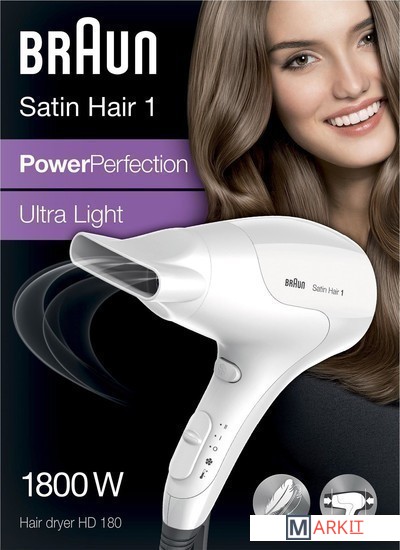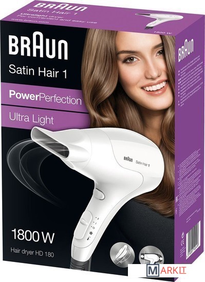 Фен Braun HD 180 компактный, легкий и мощный. Модель небольшого размера занимает мало места в квартире. Она помещается в дорожную сумку и подходит для частых путешествий. Каркас фена оснащен эргономичной петлей для удобного хранения возле розетки. Пластиковый корпус весит мало, поэтому ваша рука не устает во время сушения волос. Маленький вес увеличивает подвижность устройства и позволяет без усилий поворачивать его под нужным углом для достижения желаемого эффекта. Мощности 1800 Вт достаточно для качественного высушивания за минуты. Модель первой серии Satin Hair работает в двух режимах. Вы просто выбираете один из них, а фен самостоятельно подбирает оптимальное соотношение температуры и скорости воздушного потока. Механический регулятор делает управление очень простым и интуитивно понятным.Вентиляционный блок фена Braun HD 180 сконструирован для равномерного распределения воздушных потоков. Это значит, что прибор не будет перегревать одну часть пряди, пока вторая остается холодной. Равномерный нагрев обеспечивает быстрое высыхание и защиту от секущихся кончиков. Благодаря запатентованной технологии влага испаряется с поверхности волосков, но сохраняется внутри. Пряди остаются блестящими, не теряют свою упругость и практически не повреждаются даже при частом использовании фена.Модель Braun HD 180 укомплектована узким концентратором. Насадка направляет мощный поток воздуха на отдельные пряди, придавая им необходимую форму. Аксессуар позволяет экспериментировать с образами и не бояться экстравагантных решений. У фена доступна опция холодного обдува. Эта функция предусмотрена для фиксации локонов после укладки. Комбинируйте ее с узким концентратором для достижения фантастических результатов. Если вы не планируете делать полноценную укладку, просто воспользуйтесь феном без насадки. Так вы увеличите размер площади, которую устройство способно обработать за раз, и уменьшите интенсивность воздушного потока для защиты локонов от термического повреждения.