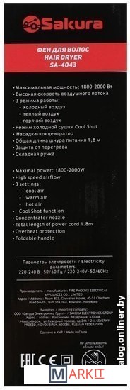 Markit » Фены для волос » Фен Sakura SA-4043W