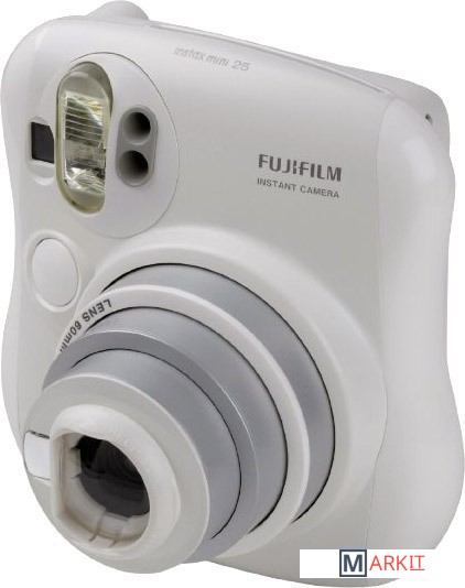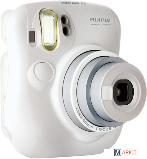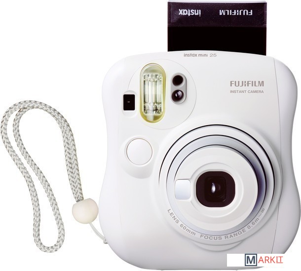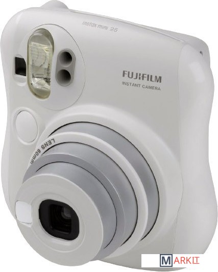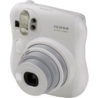 Портативная пленочная камера в белом корпусе, предназначенная для мгновенной печати на пленке Instax Mini (62 x 46 мм). Оснащена двумя кнопками спуска (для горизонтальной и вертикальной ориентации), вспышкой, небольшим зеркальцем, кнопками компенсации экспозиции и выбора режима "портрет/пейзаж". В комплекте - линза-насадка для съемки на близком расстоянии.