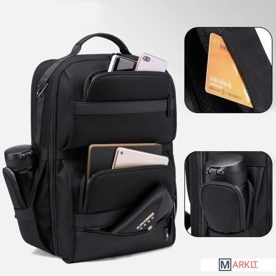 Подойдет для учебы, работы, отдыха и путешествия. Он имеет строгий дизайн и плавные формы. Модель украшена кожаными вставками, фирменными молниями (в том числе двухсторонними), карабинами для ключей, багажными лентами, холдерами для наличности или банковских карт. Спинка рюкзака сетчатая и мягкая. Она равномерно распределяет нагрузку по спине и не дает ей потеть. Лямки — широкие, мягкие и регулируются по длине. Верхняя ручка усилена дополнительными швами и оформлена кожаными вставками. В лямке расположился потайной карман для ценных вещей. По бокам предусмотрено еще два миниатюрных кармана на молниях. Фронтальная часть содержит три кармана на молниях, два из которых — объемные и подходят для вещей, которые должны быть под руками. Внутри модель BG62 имеет два вместительных отсека. В том, что ближе к спинке, разместятся ноутбук на 15,6 дюймов, планшет и телефон. В переднем отсеке можно расположить габаритные вещи: одежду, обувь, книги, аксессуары.