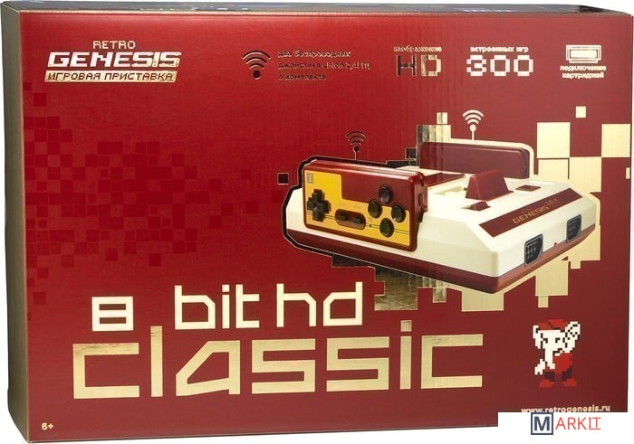 Стационарная игровая приставка Retro Genesis 8 Bit HD Classic предназначена для подключения к современным ЖК-телевизорам и мониторам в классическом корпусе с новыми функциями, которых не было ранее. Консоль обеспечивает яркую красочную картинку при подключении к современным ТВ через HDMI разъем. Больше никаких артефактов, аналоговых помех и падений яркости и цветности, которые всегда возникают, если использовать аналоговое подключение. Глубокий черный цвет и четкое изображение, увеличивают удовольствие от игрового процесса. Приставка оснащена технологией сглаживания изображения, которая позволяет выводит более мягкую и приятную глазу картинку, что особенно заметно при использовании телевизора большой диагонали.Приставка оснащается двумя беспроводными джойстиками с литий-ионными аккумуляторами, работающими на частоте 2,4ГГц, что позволяет прямиком из коробки играть в игры, предназначенные для игры вдвоем. Беспроводные геймпады позволят выбирать комфортное расстояние до экрана телевизора или монитора и не зависеть от длины провода. Для более удобного и компактного хранения контроллеров по бокам корпуса приставки присутствуют отсеки для крепления.Джойстики имеют не только кнопки A и B, но и их турбо версии, которые позволяют имитировать непрерывное нажатие. Как правило, турбо-кнопки крайне удобно использовать в играх, где необходимо постоянно нажимать на одну из кнопок. Например, в аркадных шутерах или скролл-шутерах, где необходимо постоянно поддерживать огонь из орудий персонажем игры. Радиус действия джойстиков - до 10 метров. Время работы: до 19 часов от одного заряда. Для удобства использования джойстики имеют встроенные li-ion аккумуляторы, которые можно заряжать от любого адаптера питания с разъемом microUSB, в том числе и от идущего в комплекте с приставкой. Также оснащение джойстиков аккумуляторов позволило уменьшить их толщину до классической.Список встроенных игр содержит в себе большое количество хитов 8-битной эпохи, вошедших в золотой фонд мирового наследия видеоигр.Для использования всех возможностей игровой приставки, рекомендуется использовать подключение HDMI к современным ЖК-телевизорами и мониторам большой диагонали.Дополнительный аналоговый разъем типа "тюльпан" позволяет подключать приставку и к ЭЛТ телевизорам, не оснащенным HDMI разъемом. Питание устройства осуществляется через разъем питания microUSB, который на данный момент является универсальным стандартом, поэтому является легко заменяемым. Особенности:- HD изображение и беспроблемное подключение приставки ко всем современным телевизорам через HDMI разъем.- Беспроводные джойстики со встроенными литий-ионными аккумульяторами, работающие на радиосигнале 2,4ГГц, . Радиус действия – до 10 метров. Время работы – до 19 часов.- Тумблер переключения пропорций изображения с 4:3 на 16:9. - Классическая форма корпуса «Famicom» со знакомыми узнаваемыми элементами – отсеками для хранения джойстиков, рычаг для легкого извлечения игровых картриджей и крышкой отсека картриджей, который предохраняет его от попадания излишней пыли или крошек.- NTSC стандарт вывода изображения, в котором игры идут более плавно на скорости 60 кадров в секунду.- Быстрый выход в раздел выбора встроенных игр с помощью кнопки Reset. Моментальная загрузка.- Совместимость с игровыми картриджами для Dendy и Famicom.- 