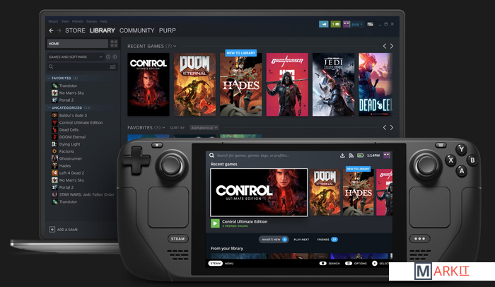 В сотрудничестве с AMD Valve создали специальный гибридный процессор для Steam Deck, оптимизированный для портативных игровых ПК. Мощности этого процессора, функционирующего на базе Zen2 и RDNA2, более чем достаточно для запуска новейших высокобюджетных игр.Когда вы войдёте в свой аккаунт на Steam Deck, то увидите всю свою библиотеку Steam, как на любом другом ПК. Вы сможете найти свои коллекции и избранные игры там, где их оставили.Официальная док-станция соединит Steam Deck с внешними экранами, проводной сетью, периферийными устройствами USB и источниками питания. Если у вас уже есть активный концентратор USB-C, можете использовать и его. Официальная док-станция будет продаваться отдельно.