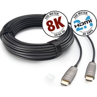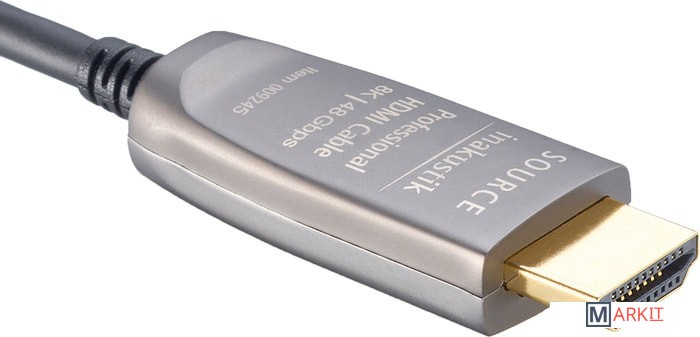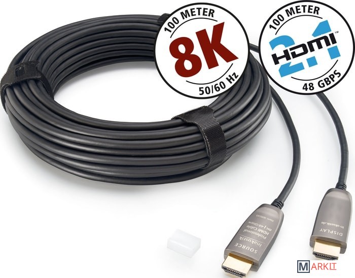HDMI-кабель с использованием профессиональной оптоволоконной технологии. Эта технология обеспечивает скорость передачи данных до 48 Гбит/с при дальности передачи до 100 м. Таким образом, кабель поддерживает форматы с высоким разрешением 8K с 50 и 60 Гц, технологию HDR и представляет собой оптимальное решение для соединения устройств с интерфейсом HDMI 2.1 на большом расстоянии. Кабель имеет встроенные электронные компоненты и поэтому зависит от направления движения.