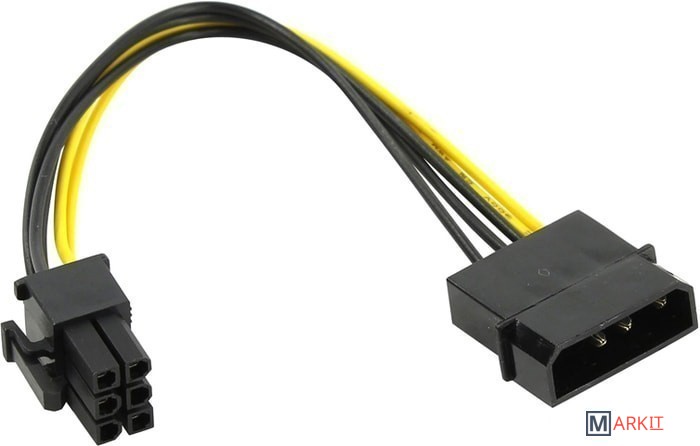 Переходник для дополнительного питания видеокарты через 6-пиновый разъем от коннектора Molex (питание устаревших HDD IDE) блока питания компьютера.