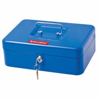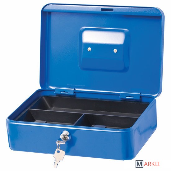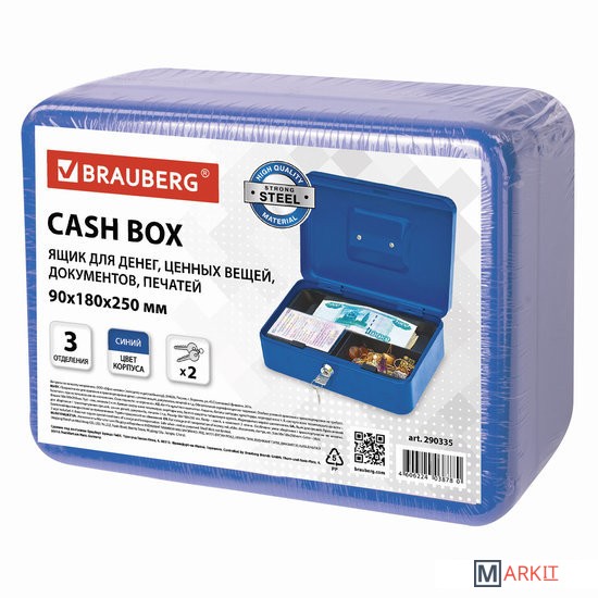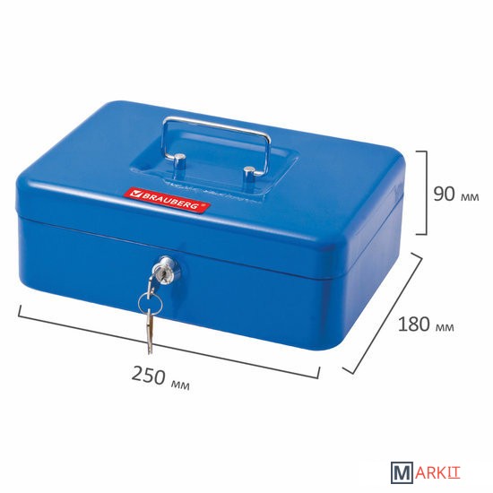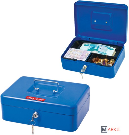Ящик BRAUBERG предназначен для хранения и транспортировки денег, ценных вещей, документов, печатей, медикаментов. Используется дома и в офисе для ограничения доступа посторонних лиц. Отличное сочетание надёжности и вместительности.Съемный лоток из ударопрочного пластика с 3 отделениями. Подходит для денег, карточек, ключей, печатей. Под лотком есть пространство, где можно хранить документы и бумаги.Изготовлен из стали толщиной 0,8 мм. Надежный корпус с удобной ручкой выполнен в синем цвете. С ключевым замком, в комплекте 2 ключа.