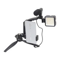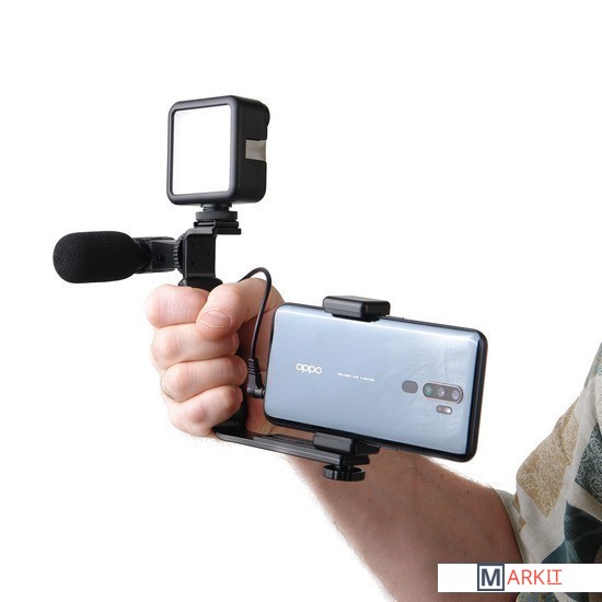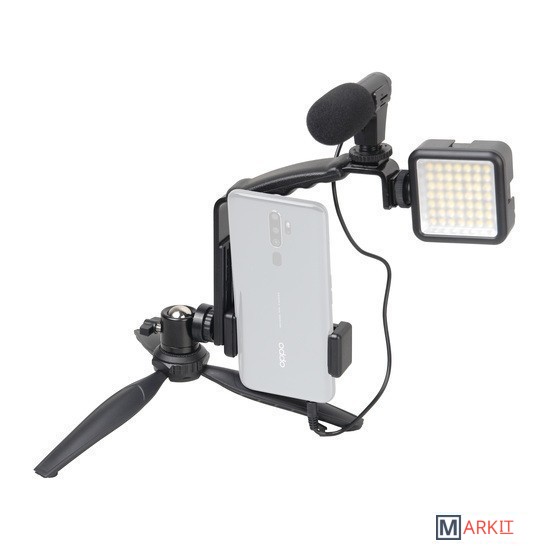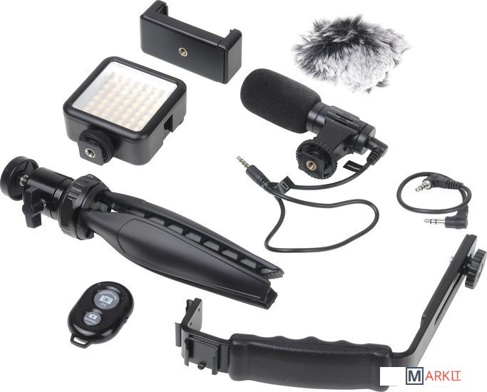 предназначен для быстрой организации видеосъёмки или стриминга с помощью камеры смартфона. В комплект входит все необходимое оборудование для получения качественного видео/аудиоконтента. Настольный штатив с держателем для смартфона предотвращает «шевеление» кадра. Светодиодный осветитель с регулируемой яркостью и световым потоком сбалансированного белого цвета помогает снимать яркую и контрастную картинку в естественных цветах. Микрофон с держателем и ветрозащитными насадками повышает качество записываемого звука. А селфи-кнопка дает возможность дистанционно управлять камерой смартфона по Bluetooth.ТриподНастольный штатив изготовлен из прочного ABS пластика и укомплектован надежной металлической шаровой головкой, позволяющей установить оборудование под наклоном. Оборудование, вращается вокруг своей оси на 360° и наклоняться на 90° вперед. В сложенном виде штатив длиной 210 мм удобно использовать как монопод, с закрепленным на нем комплектным оборудованием.Держатель для смартфонаРегулируемый держатель для установки смартфона на штатив вмещает мобильные устройства шириной от 58 мм до 87 мм. Держатель снабжен противоскользящими резиновыми накладками – смартфон не поцарапается и не выпадет держателя. На торцевой и тыльной сторонах держателя находятся металлические гайки с резьбой 1/4" для крепления на штативе.ОсветительСветовая панель накамерного осветителя состоит из 49 ярких светодиодов выдающих световой поток без мерцания с цветовой температурой 5500К ±200К. Встроенный несъемный матовый рассеиватель смягчает световой поток, благодаря создается ровное бестеневое освещение. Яркость осветителя регулируется при помощи бесступенчатого диммера-регулятора от 0% до 100%, цветовая температура и CRI остаются при этом неизменными. Осветитель питается от 2 батарей типа АА (приобретаются отдельно).МикрофонЧастотная характеристика накамерного микрофона оптимизирована для использования во время видеозаписи интервью, репортажей, мастер-классов и других "живых" съемок с синхронной записью звука. Высокая разборчивость речи достигается за счет использованы надёжных миниатюрных микрофонных капсюлей электретного типа. Компактный пластиковый корпус обеспечивает небольшой вес микрофона. В комплект входит две ветрозащиты (поролоновая и меховая), которые гасят низкочастотные звуки и позволяют производить видеосъемку с записью звука как в помещении, так и на улице.Крепления для аксессуаровМеталлический кронштейн, входящий в комплект, закрепляется на настольном штативе при помощи гнездового отверстия 1/4". Конструкция кронштейна выполнена таким образом, чтобы уравновесить устанавливаемое оборудование и предотвратить опрокидывание. Накамерный осветитель и микрофон устанавливаются на кронштейне в крепления типа "башмак". Держатель смартфона крепится на винт 1/4". Кронштейн имеет удобный рифленый хват для переноски и перестановки комплекта.Пульт ДУСелфи-кнопка для управления камерой смартфона подсоединяется к мобильному устройству дистанционно по протоколу Bluetooth. Нажатие кнопки запускает срабатывание фотокамеры и начала (окончания) записи видео. Пульт питается от батареи типа CR2032 (не входит в комплекте). Селфи-кнопка совместима с большинством устройств Apple iPhone, iPad и Android, оснащённых Bluetooth-протоколом.