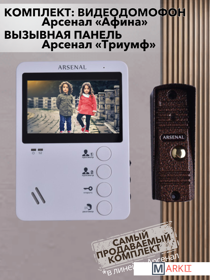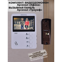 Комплект видеодомофонии Arsenal Афина + Триумф - это популярный и надёжный комплект видеодомофона и вызывной панели. Оба изделия в комплекте на 100% совместимы друг с другом и могут быть без особых трудностей смонтированы и подключены при наличии навыков владения перфоратором.Видеодомофон Арсенал Афина оснащён 4" монитором и механическими кнопками. Вызывная панель Арсенал Триумф оборудована камерой 420 ТВЛ с ИК подсветкой и антивандальным корпусом, который защитит панель от физических повреждений, воды и грязи.При помощи этого комплекта Вы всегда сможете увидеть, кто звонит Вам в дверь. Также, если живёте в многоквартирном доме, имеется возможность подключения к подъездному домофону. В том случае, если Вы живёте в частном доме, к домофону подключается электрозамок, который можно открывать не выходя из дома.Вместе с домофоном и панелью прилагаются кронштейны для обоих устройств и козырёк для вызывной панели.