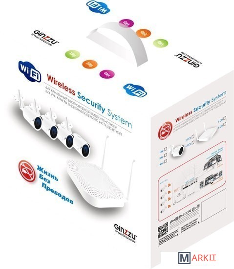 Комплект видеонаблюдения Ginzzu HK-423W c 2 WiFi камерами с матрицей 4.0Mp, разрешением записи до 4k (с дополнительными камерами), удаленное наблюдение и контроль, а так же встроенная ИК подсветка до 30 метров, защищенный корпус уличных камер и встроенный коммутатор для подключения 3х проводных камер.