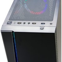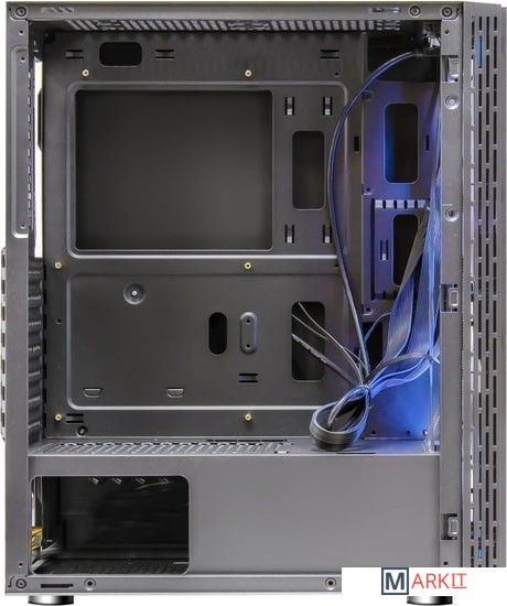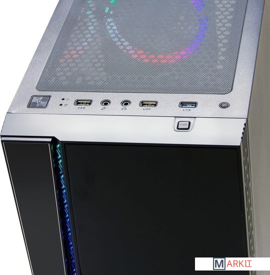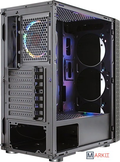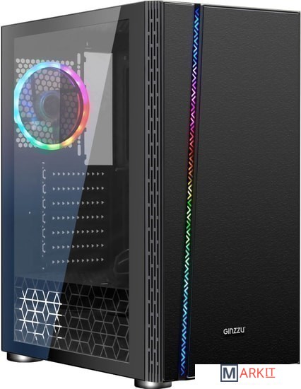 Формат шасси mATX/ATX черного цвета.Прочное шасси из стали с качественной завальцовкой.Разъем USB 3.0, три посадочных места для SSD.Боковая панель из закаленного стекла.Съемная корзина для HDD, кабельные каналы.RGB подсветка передней панели с 16-ю режимами, 12 см LED вентилятор сзади, кнопки управления сверху.Блок питания в отдельном воздуховоде, фильтр забора воздуха.