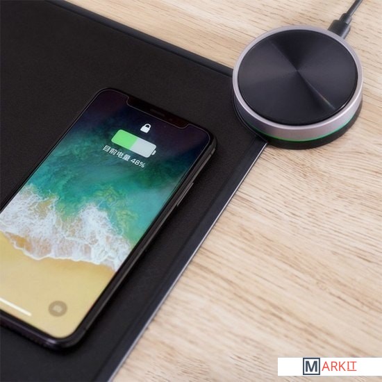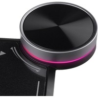 Данный коврик оснащен функцией беспроводной зарядки стандарта Qi. Благодаря этому его можно использовать не только для подзарядки мышки, но и мобильного телефона. Также оснащен колесом управления подсветкой.