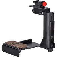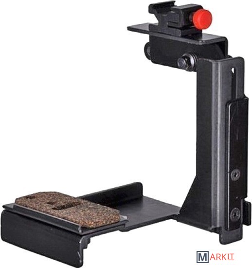 Крепление для установки фотокамеры c дополнительным блоком питания и накамерной фотовспышки (Canon, Nicon, Olympus) над ним. Расстояние между площадкой установленной на нижней планке и верхней планкой 13 см.На верхней планке устанавливается накамерная фотовспышка, площадка на верхней планке может менять своё положение на 90 градусов. Нижняя планка (установка фотокамеры) имеет длину 9 см, также на ней имеется отверстие с резьбой (диаметр 5.5 мм), что позволяет установить кронштейн на различные виды штативов. Площадка на нижней планке установлена на 8 см впереди горизонтальной плоскости установки накамерной фотовспышки.