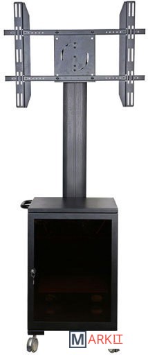 Мобильная стойка MediaPRO 1100 для дисплея с диагональю 30-60", максимальным весом 60 кг иVESA 800x400 максимум. Стойки имеет металлическую тумбу (размер, ГхШхВ: 500 х 500 х 700 мм), куда можно установить различное оборудование. Тумба закрывается на ключ, что бы ограничить доступ и обеспечить сохранность установленных устройств. Блок розеток внутри тумбы и на профиле обеспечивают удобное и быстрое подключение устройств. Кабель канал организует провода, что бы они не мешали в процессе эксплуатации или перемещения тележки. Дополнительно можно добавить такие опции как полки для видеокамеры, кодека и т.п. Каждая полка может нести нагрузку до 20кг, а тумба до 30 кг.
