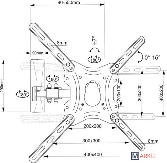 | Угол поворота (без ТВ) | 90 ° |
