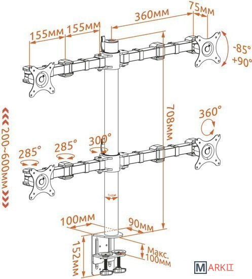 | Функциональные особенности | поворотный, для 4 мониторов |