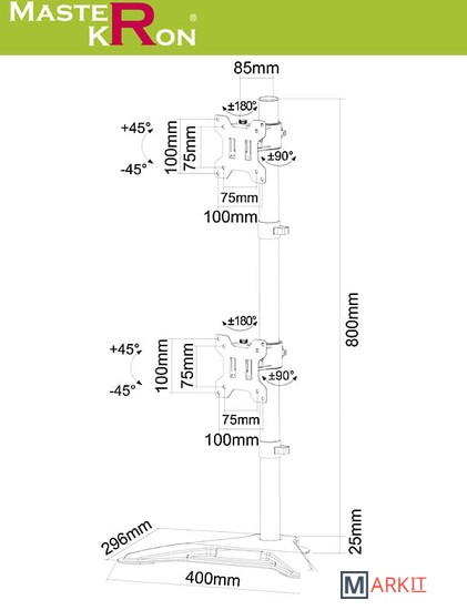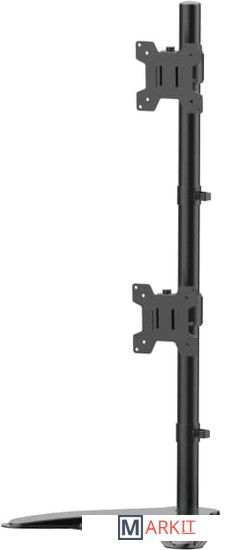 Устанавливается на собственную подставку и удобен в том случае, если невозможно использовать крепления за столешницу. Регулировки кронштейна позволят разместить два монитора от 13" до 27" один над одним на рабочем месте. Удобные регулировки наклонов, поворотов и высоты размещения мониторов "на весу". Выдерживает нагрузку до 8кг на каждый монитор.