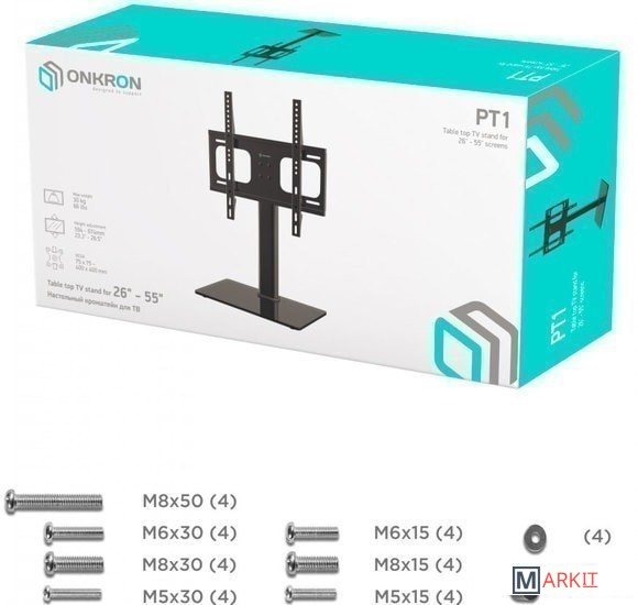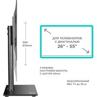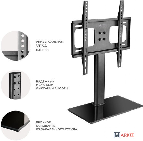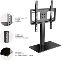 ПОДХОДИТ ДЛЯ ШИРОКОГО МОДЕЛЬНОГО РЯДА ТВ Если существует потребность установить ТВ на горизонтальную поверхность, а стандартная подставка отсутствует или не вписывается в существующий интерьер разумным решением станет настольная подставка РТ1 . Подставка позволяет не только установить ТВ но и отрегулировать его по высоте.ШИРОКИЙ ДИАПАЗОН VESA КРЕПЛЕНИЙПеремещая направляющие на основании кронштейна можно выбирать подходящее для ТВ крепление в диапазоне от 75х75 до 400х400 мм в зависимости от диагонали ТВ.УНИВЕРСАЛЬНАЯ ПОДСТАВКА ДЛЯ ТВНастольная подставка предназначена для плоскопанельных телевизоров с диагональю экрана от 32 до 55 дюймов, что делает её более универсальной в сравнении с аналогами.Вы сможете с легкостью регулировать телевизор по высоте в диапазоне от 594 до 674 мм, в зависимости от диагонали ТВ и ваших личных предпочтений.ПРЕМИАЛЬНЫЙ ДИЗАЙНПрочное основание из закаленного стекла толщиной 10 мм не только обеспечит устойчивое, надежное крепление ТВ, но и дополнит любой интерьер. Черное, глянцевое основание прекрасно впишется в интерьер как жилого помещения так и дополнит рабочее пространство.