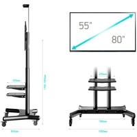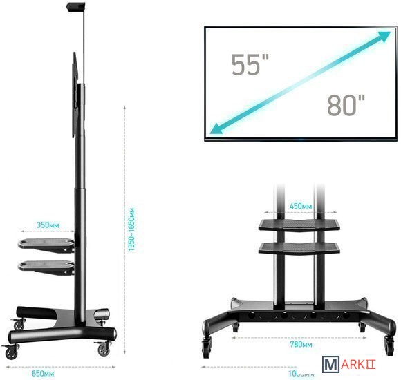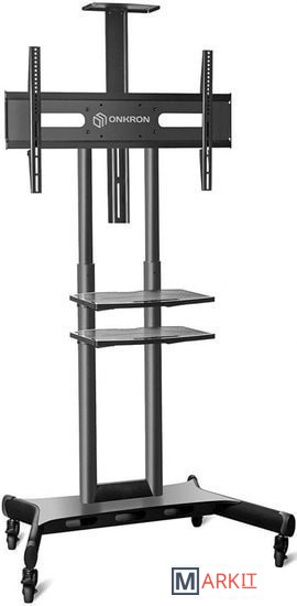 Мобильная стойка ONKRON TS1881 подойдёт для ЖК, Плазменных и LED телевизоров и панелей с диагональю от 55"-80" и впишется в любой интерьер.Если Вы ищите стенд с колёсами для большого, или не очень, телевизора, но при этом необходимо разместить всё на достаточно ограниченном пространстве, допустим в конференц-зал, переговорную, в свой кабинет, в выставочный зал, ресторан или кафе, то Мобильная стойка ONKRON TS1881 одно из самых лучших решений. Выполнена из сверхпрочной стали, на неё нанесено качественное чёрное порошковое покрытие, что придаёт ей ещё большей превлекательности во внешнем виде. А две надёжные вертикальные трубы, дополнительно усиленные по центру и регулирующиеся по высоте от 1350 мм до 1650 мм, позволят Вам установить на стойку телевизор весом до 90.9кг, и диагональю до 80" и без особых усилий подкорректировать его положение по вертикали.