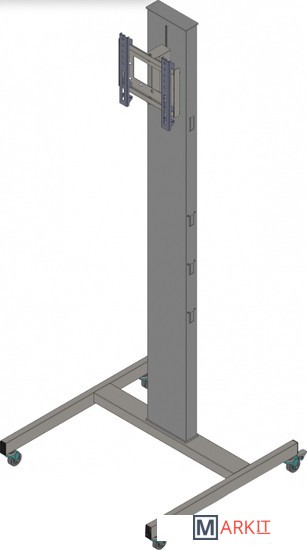 Мобильная стойка для TV до 40", max VESA 200х200, max 50 кг, поворот дисплея 30 градусов, возможность установки стойки на опоры или на колеса (опция), полки для аппаратуры и для видеокамеры (опции), кабель канал внутри стойки, защита от падения TV, коррекция горизонтального перекоса TV (+/-3 градуса)